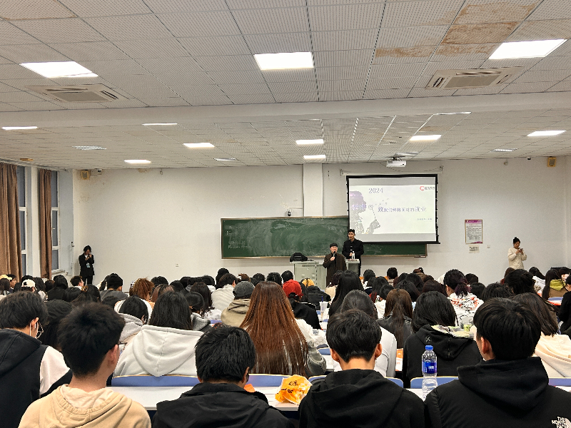 傍晚六时,讲座准时开始。关鹏首先带领大家分析了当前的就业形势,让同学们了解到当前就业市场的状况和未来的发展趋势。随后,他将毕业生的走向分为单位就业、创业、自由职业、升学等四类,并客观地分析了这四个走向的优势和劣势,让同学们尽早对自己的职业有确定的规划。最后,他鼓励同学们尽早选择适合自己的就业去向,并提前做好相应准备。