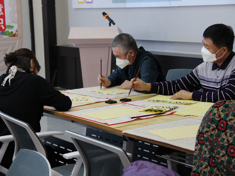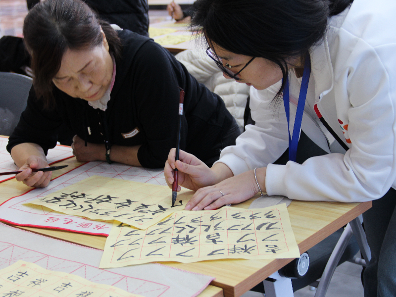 课程伊始,志愿者们耐心细致地带领老人们回顾了横、竖、折等书写的基本笔画。在志愿者们的悉心指导下,老人们如同打开了记忆之门,迅速回忆起之前所学的书法知识,他们挥毫泼墨,流畅自如地书写出“福”、“吉祥”、“中华”等充满祝福与自豪的书法作品,脸上洋溢着在书法世界中遨游的快乐与满足。