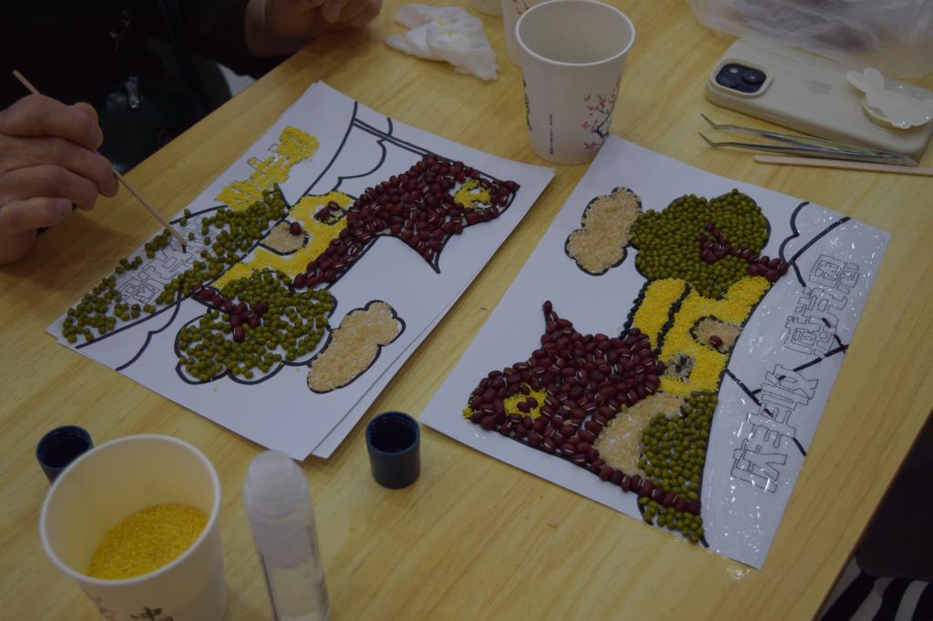随后,活动转入了“五谷飘香”的手工绘制环节。志愿者们与老人学员携手合作,以各类植物种子和五谷杂粮为素材在洁白的纸张上进行绘制。在志愿者们的悉心指导下,老人们巧妙地运用胶水和水,将五谷杂粮粘贴在纸上,创作出一幅幅充满创意与匠心的画作。这一过程中,老人们的动手能力得到了锻炼,他们的脸上洋溢着满足与喜悦的笑容。同时,志愿者们也在实践中收获了宝贵的经验。