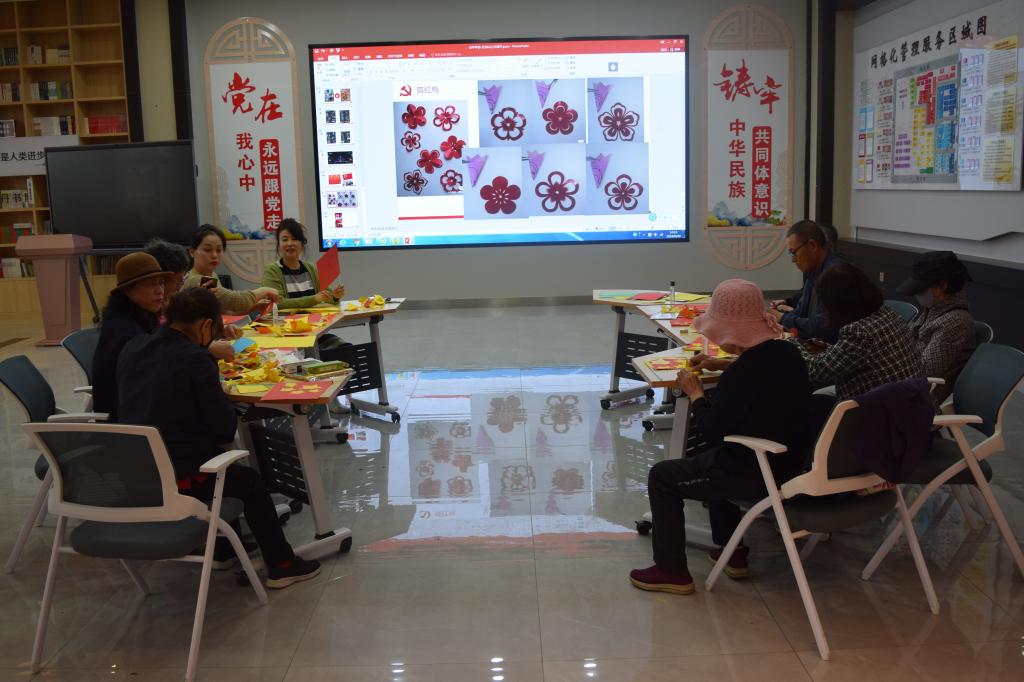 活动伊始,卧龙青年服务队的志愿者们与老人们共唱爱国歌曲《红梅赞》,“红梅花儿开,朵朵放光彩”,熟悉的歌词和曲调仿佛带着大家回到了那个“一片丹心向阳开”的年代。接着,志愿者向老人们讲述江姐红色事迹,不论是丧夫之痛,还是严刑拷打,都无法动摇江姐为党为民的坚定决心。最后,小教师们教老人们“剪红梅”、制作五星红旗,在动手操作中不仅激发了大家的爱国主义情怀,对革命烈士的敬仰更是油然而生。志愿者们耐心指导,老人们认真裁剪彩纸,活动室内萦绕着浓浓的红色氛围。