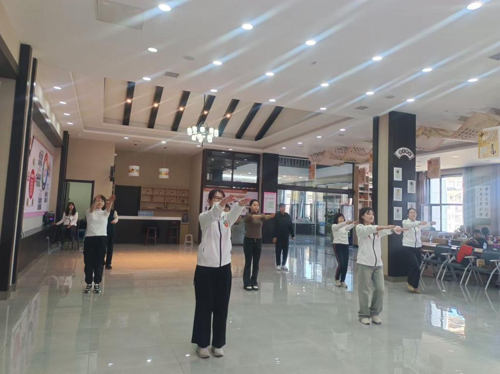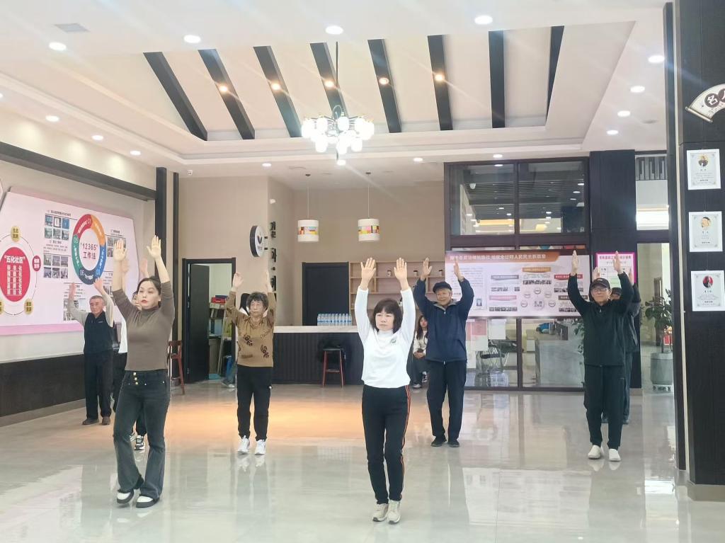 此次课程主要分为两个环节,分别是健身操基础知识讲解和健身操上肢运动动作示范,旨在提高老年人的身体素质、生活技能和社交能力。佳木斯快乐舞步健身操,是融广播体操、健步走、舞蹈和传统养生为一体的有氧健身运动,因其简单易学、节奏明快、效果明显、老少皆宜的特点,迅速在全国普及并推广到国外。2014年,经国家体育总局组织专家组进行评定,佳木斯快乐舞步健身操成为国家体育总局在全国推广的广场操之一。老年人在员工志愿者们的带领下通过练习健身操可以提高身体机能,促进老年人脑部健康,延缓认知功能衰退。