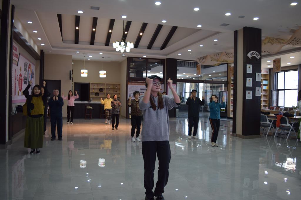 小教师给老人做动作示范